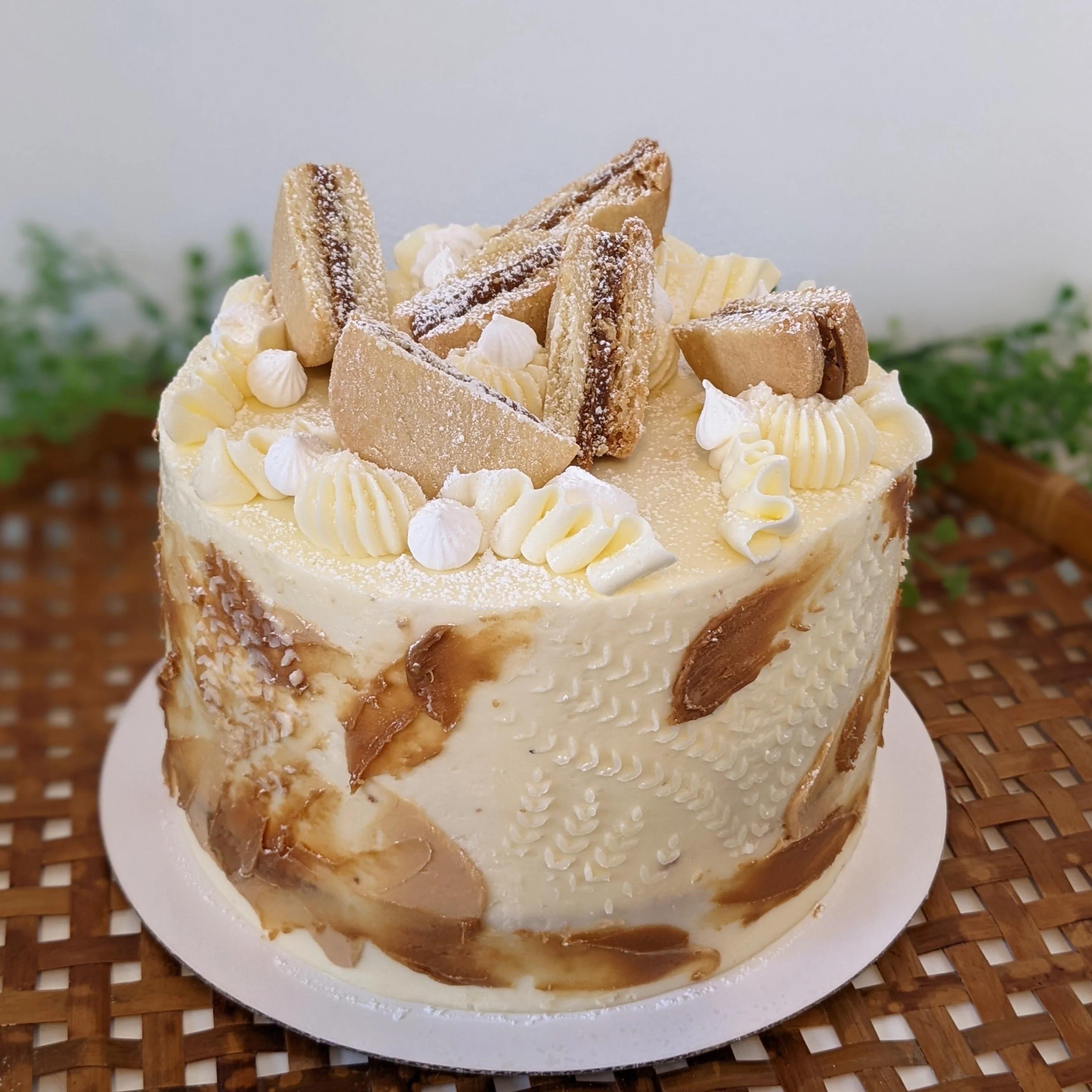 Moist vanilla cake filled with Dulce de leche covered with our well-balanced Swiss buttercream and buttery Alfajores on top.