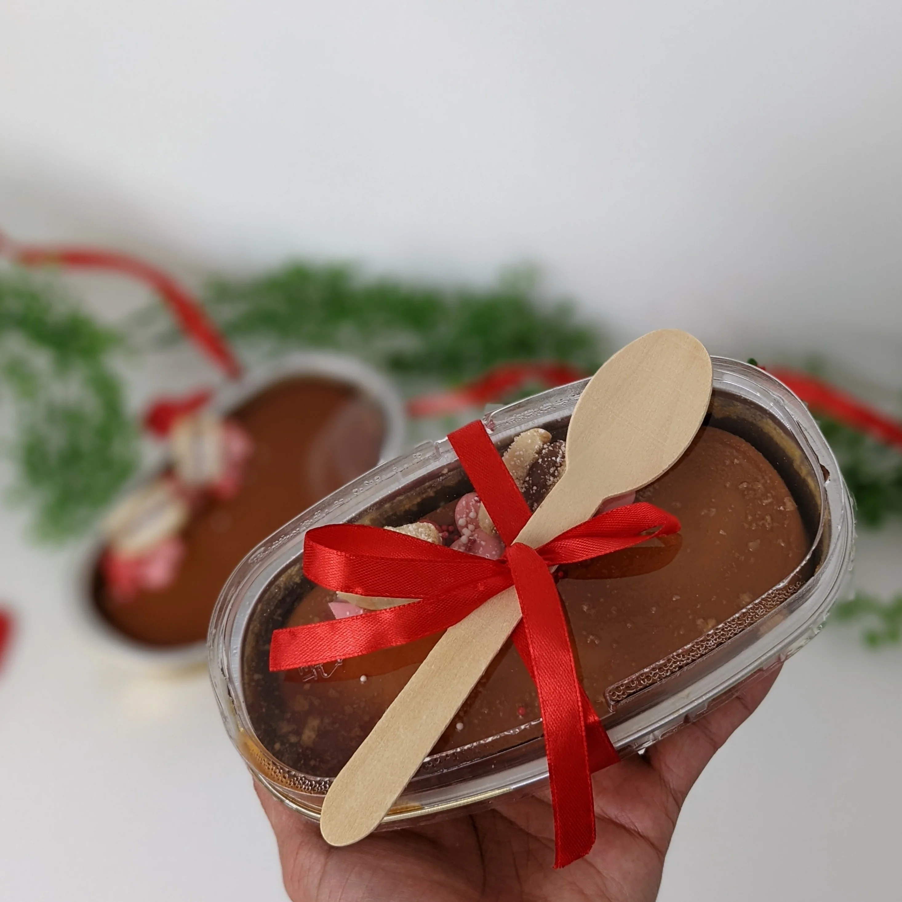 The order includes two oval flans. Each flan is decorated with Swiss buttercream, a mini Alfajor, and a wooden spoon, and it's ready to eat!